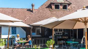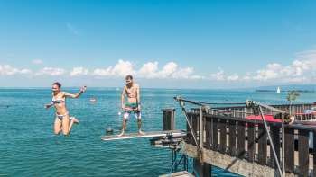 Die Badhütte aus dem Jahr 1924 ist das einzig verbliebene Bauwerk seiner Art am Schweizer Bodenseeufer. Die hölzerne Badeanstalt steht auf Pfeilern im See und ist nur über eine Brücke vom Ufer her zu erreichen. Sie ist nicht nur eine Touristenattraktion, sondern auch ein wichtiger Treffpunkt für die einheimische Bevölkerung. Das Restaurant mit Plätzen im lauschigen Innenhof und auf der Zugangsbrücke verwöhnt nicht nur die Badegäste sondern auch Spaziergänger mit frischen Getränken, Kaffee und Kuchen.