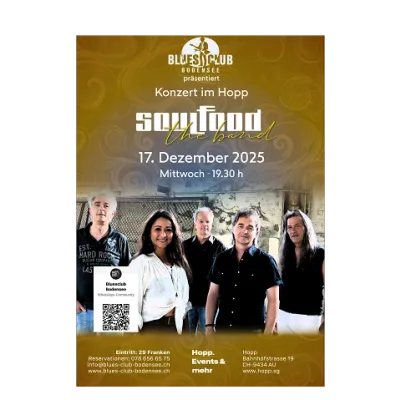 Fünf Musiker aus Appenzell, Zürich und Schwyz kochen musikalisches Soulfood mit ausgewählten Coversongs von Künstlern wie Etta James und Ray Charles. Website: www.soulfood.ch.