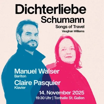 Bariton Manuel Walser und Pianistin Claire Pasquier widmen sich Robert Schumanns "Dichterliebe" Opus 48 nach Gedichten von Heinrich Heine und den "Songs of Travel" von Ralph Vaughan Williams nach Texten von Robert Louis Stevenson. Die persönlich dargebotene Klangreise durch die facettenreiche Welt der deutschen und britischen Romantik erwartet Sie am 14. November in der Tonhalle St. Gallen.