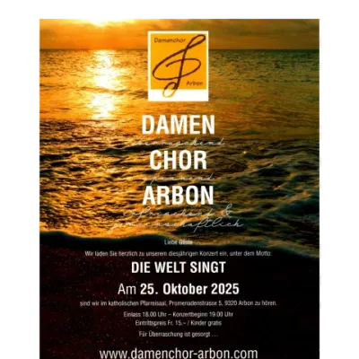 Der Damenchor Arbon präsentiert unter Leitung von Daniela Vögeli erfrischend neue Lieder aus aller Welt mit den Solisten Brigitta Gehrig (Sopran), Marco Cerbella (Piano) und Hendrika Tanner (Flöte).