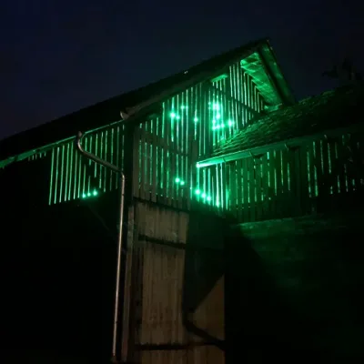 Die durchlässige Bauweise der Zigerlihütte lässt das grüne Neonlicht aus dem Innern erstrahlen und der dumpfe Sound der Transformatoren dringt nach aussen in die Stille der Nacht. Alles was drinnen passiert, kann von aussen wahrgenommen werden. Die Grenzen von innen und aussen verschwimmen. Die Zigerlihütte interagiert dabei ständig mit der Umwelt.