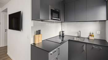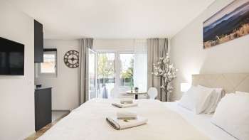 Eine Garderobe und Schrank bieten viel Platz für Kleider und Gepäck. Für die Unterhaltung an ruhigeren Tagen steht nicht nur kostenloses WLAN, sondern auch ein neuer Smart-TV samt Netflix-Konto und ein SunriseTV-Abo zur Verfügung.