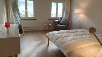 Neben den vier Zimmern hat es eine Küche mit folgenden Geräten: drei Herdplatten und Backofen, Nespresso Kaffeemaschine, Wasserkocher, Haushaltmaschine, Toaster, Raclette Ofen, Käse- und Chinois Geräte, Kühlschrank, Geschirrspüler und übliche Küchenutensilien.