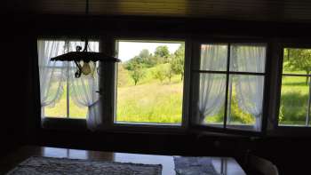 Das Ferienhaus zur Alleinbenützung steht mitten im Wiesland. Es bietet viel Platz im und ums Haus.
