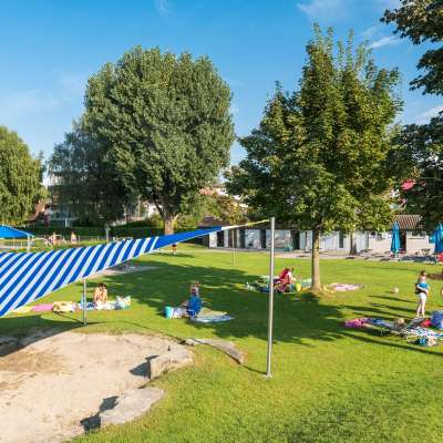 Eine grosse Wiese mit diversen Spielmöglichkeiten sowie viel Platz zum Ausspannen und Geniessen laden zum Baden ein. Das Schwimmbad bietet ein grosses Nichtschwimmerbecken und auch die Kleinsten können sich im Planschbecken mit Wasserpumpe vergnügen. Ein Spielplatz sowie ein Volleyballfeld runden das Angebot ab.