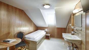 Die preiswerten, freundlich eingerichteten Zimmer sind teilweise mit Dusche ausgestattet. Das grosszügige 36m² Zimmer im ersten Stock mit Sitzecke und eigenem Bad bietet genug Raum zur Entspannung. Es eignet sich auch bestens für Familien.