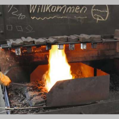 Nun wird es heiss – unter dem rhythmischen Schlag des Hammers verformt sich das glühende Eisenblech, und allmählich nimmt das Werk seine endgültige Form an. Mit verschiedenen Techniken werden die Einzelteile zusammengefügt bis am Ende ein harmonisches Ganzes entsteht.