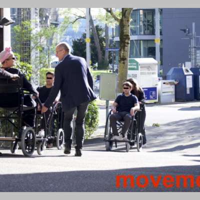Mit «movements I» lernen die Teilnehmenden lebendige und vielseitige öffentliche Orte auf eine ganz neue Art kennen. Sie sitzen mit geschlossenen Augen auf einer fahrbaren Plattform und werden von einem anderen Gast durch das Areal gestossen.