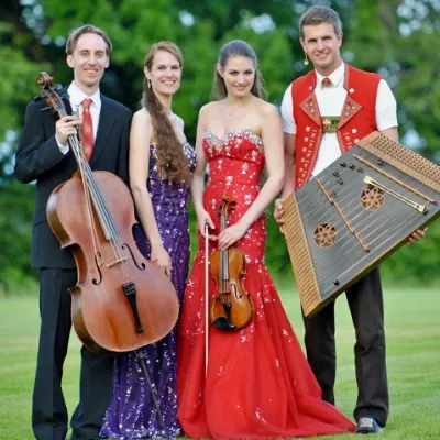 Vor elf Jahren haben sich der bekannte Hackbrettler Nicolas Senn und das Trio Fontane mit Noëlle Grüëbler (Violine), Jonas Kreienbühl (Violoncello) und Andrea Wiesli (Klavier) zusammengetan und gemeinsam das mitreissende Projekt «Klassik trifft Folklore» ins Leben gerufen. Der Erfolg dieser virtuos-lustvollen Crossover-Produktion liess nicht auf sich warten: Ausverkaufte Konzertsäle und Auftritte im Rahmen des Schweizer Fernsehens begleiten die Formation seit ihrer Gründung. «Rendez-vous von feinster Klassik mit Appenzeller Folklore» titelte die Luzerner Zeitung nach einem ihrer umjubelten Konzerte. In Gonten wird das Quartett auch Innerrhoder Tanzmusik im ganz besonderen Arrangement des versierten Ensembles erklingen lassen.