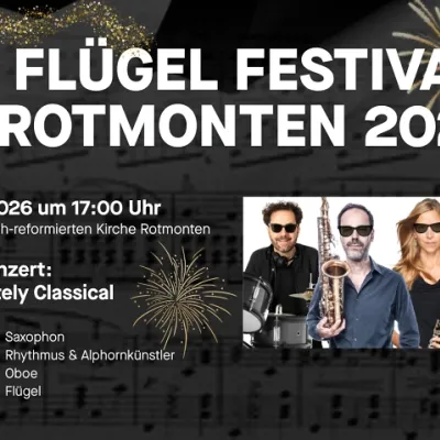 Für das Jubiläumskonzert am 4. Januar kehren Peter Lenzin (Saxophon) und Helen Moody (Oboe) zum Flügel Festival zurück. Neu mit dabei: Peters Bruder Enrico Lenzin, ein einzigartiger Rhythmus-Künstler, der mit Schlagzeug, Alphorn und überraschenden Klangideen seit Jahren national und international begeistert. Seit seinem Durchbruch bei der SRF-Show «Die grössten Schweizer Talente» gilt er als einer der kreativsten Performer der Schweiz.