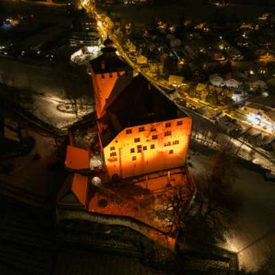Vom Internationalen Tag gegen Gewalt an Frauen bis zum Tag der Menschenrechte leuchtet das Schloss in orangem Licht.