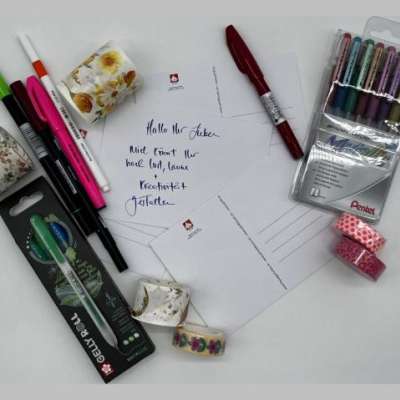 Verschiedene Stifte und Schreibgeräte stehen bereit, damit du malen, schreiben und deiner Fantasie freien Lauf lassen kannst. Ob bunt, verspielt oder schlicht – jede Karte wird zu einem kleinen Unikat.