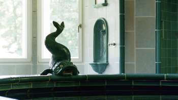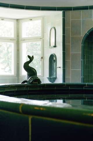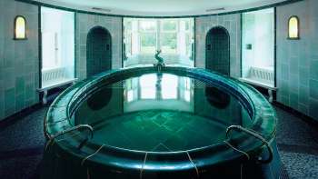 Das historische "Türkise Bad" ist ein 5,5 m grosses Bade-Oval aus dem Jahr 1928. Hier lässt es sich nach einem Saunagang vollkommen erholen. Auch die Liegeterrasse mit Blick auf die Baumkronen des Schlossparks lädt zur Entspannung ein.