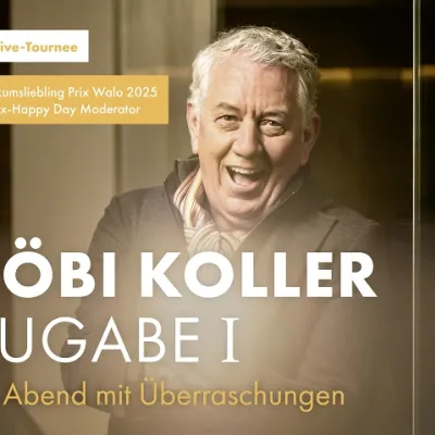 Man kennt ihn aus dem Fernsehen. Man hat mit ihm geweint, gelacht – manchmal sogar beides gleichzeitig. Und jetzt ist er zurück. Röbi Koller betritt erneut die Bühne – diesmal solo. Ohne Studiokameras, aber mit einem Sack voll Geschichten, Sprachwitz und vielen Überraschungen. Röbi Koller, die Happy-Day-Ikone und diesjähriger Prix-Walo-Publikumsliebling, präsentiert sein erstes Bühnenprogramm: «Zugabe – Ein Abend mit Überraschungen.»