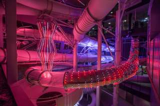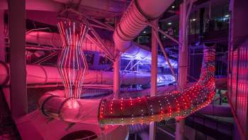 Besonders beeindruckend ist die Rutschenwelt mit zwölf spektakulären Wasserrutschen, die durch Licht- und Soundshows ergänzt werden. Besuchende können zwischen drei Virtual-Reality-Erlebnissen auf der Rutsche Wildbach wählen, Kristalle auf der Kristalljagd sammeln oder sich bei einem Wettrennen auf der Super-G messen.