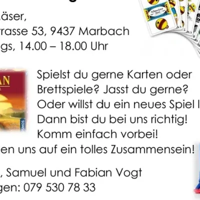 Spielst du gerne Karten oder Brettspiele? Oder willst du ein neues Spiel kennen lernen? Jasst du gerne? Dann bist du bei uns richtig! Komm einfach vorbei! Wir freuen uns auf ein grossartiges Zusammensein!