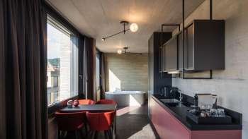 Auf dem Dach laden eine Dachterrasse sowie ein kleiner Wellnessbereich mit Sauna, Workout Raum und Hot Pot zum Verweilen ein.