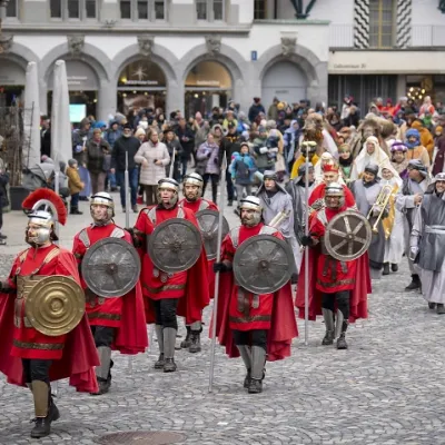 Die Weihnachtsgeschichte wird ab 13.45 Uhr lebendig: Dann ziehen Darstellerinnen und Darsteller sowie Tiere vom Klosterplatz über den Gallusplatz, die Weber- und Multergasse zum Bärenplatz und verteilen sich von dort aus an die verschiedenen Schauplätze.