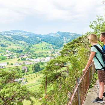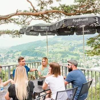After the first stage across flowering meadows and through shady forests, the Restaurant Bären serves you a hearty starter of Gruber specialties. With newfound energy, you make your way up to the Fünfländerblick vantage point. Enjoy the spectacular view over Lake Constance and five countries: Switzerland, Austria and the former independent states of Baden, Württemberg and Bavaria. The hike continues to the Treichli restaurant, which offers a real classic, garnished with a breathtaking view of Lake Constance. Now it's time to descend to the Steiniger Tisch excursion destination, where a well-earned dessert awaits you with the best views over the Thal vineyards. The last stage ends at Rheineck railroad station, where the S-Bahn will take you back to St.Gallen in comfort. En Guätä!