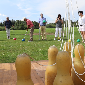The big leisure fun "Golferei.ch" in Mörschwil on the ostrich farm is a fun for big and small from 6 years. On a natural meadow, players play with egg-shaped clubs and ostrich egg-sized balls through liquid manure barrels, tractor tires and much more. At the end there is not only a podium for the winner's photo, but also a small self-service restaurant for a cozy end.