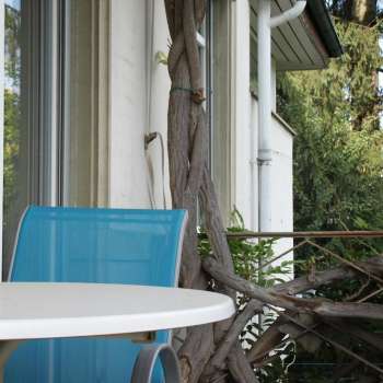 A covered balcony with a view of the treetops, two chairs and a table invite you to sit and relax.