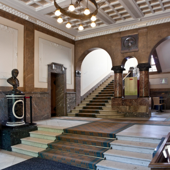 Inside the building - in the entrance hall and in the corridors - the many heavy and precious materials (limestone, sandstone, slate and all kinds of marble) are striking. A sixth of the construction costs are said to have been spent on stone carving! Colored marble panelling, Art Nouveau stucco work, coffered ceiling, artistic glazing and ironwork: The building is largely preserved in its original condition both inside and out. According to experts: the most beautiful Swiss library and archive building from the turn of the century.
