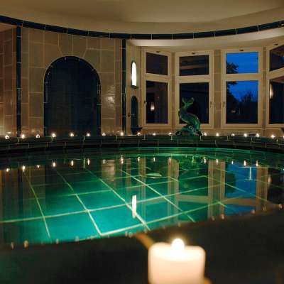 The historic “Turquoise Bath” is a 5.5 m oval bathing pool dating from 1928. Here you can relax completely after a sauna session. The sun terrace with a view of the treetops of the castle park also invites you to relax.