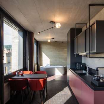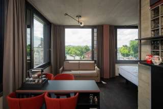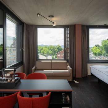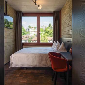 The Tailormade Hotel LEO St.Gallen was designed by the renowned architect Roger Boltshauser and is located directly at the train station St.Gallen in close proximity to the highway connection St.Gallen City. Timeless design with organic materials such as adobe and solid wood characterize the image of the elegant building right next to the Lokremise.