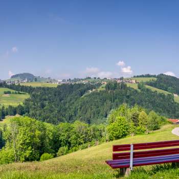 Attention cyclists: on the cycle path in Rehetobel, a rapid descent with fantastic views awaits you. Down the Lobenschwendistrasse, the view of St.Gallen and Appenzell mountains and forests opens up. A bench invites you to enjoy the moments during a breather.