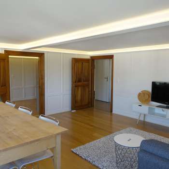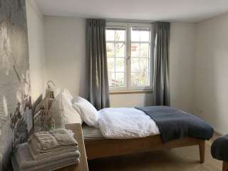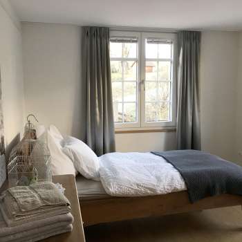Construite en 1811, la « Haus zur Rose » a été entièrement rénovée en 2015/2016 et propose à la location un appartement de vacances (95 m²) doté d'une cuisine entièrement équipée au design moderne (avec plaque à induction, hotte aspirante, four, lave-vaisselle, réfrigérateur, congélateur et lave-linge avec sèche-linge intégré), 3 chambres (1 lit double, deux lits simples et un canapé-lit confortable), 1 salle de bains avec douche/WC, 1 salon (avec canapé, grande table à manger et télévision), 1 salon de lecture/bureau (avec un magnifique secrétaire ancien ainsi que des jeux pour nos petits hôtes).