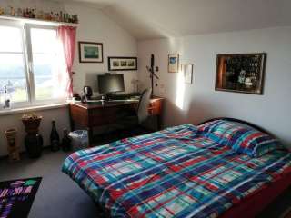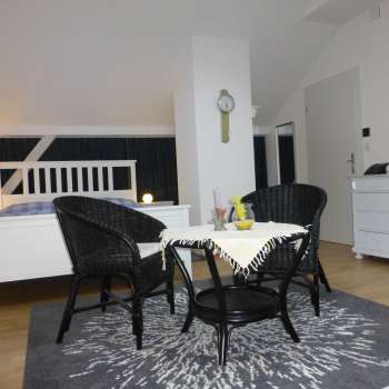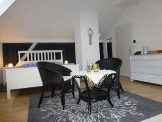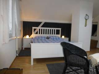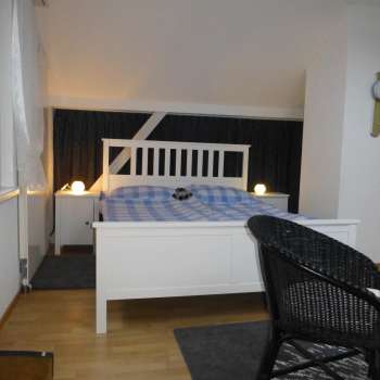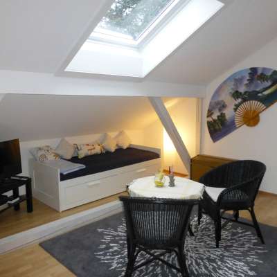 Une grande chambre mansardée (22 m2) lumineuse et fraîchement rénovée pour 2-3 personnes avec TV, radio, W-Lan, bouilloire électrique, un lit double ainsi qu'un canapé-lit. A côté, une salle de bain moderne récemment construite est à la disposition des hôtes pour leur usage personnel.