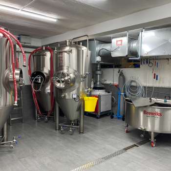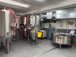 L'installation de brassage se trouve au sous-sol du local. Elle se compose d'une cuve d'empâtage, d'une cuve de clarification et de quatre cuves de fermentation. En une journée de brassage, on obtient ainsi 500 litres de moût de bière.