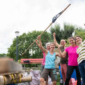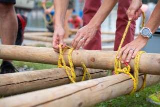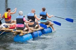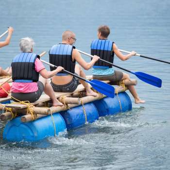 Bienvenue à la construction de radeaux ! Ici, il s'agit de bricoler, d'assembler ensemble et, à la fin, de profiter de la récompense : une balade en radeau sur les plus beaux lacs de Suisse orientale.