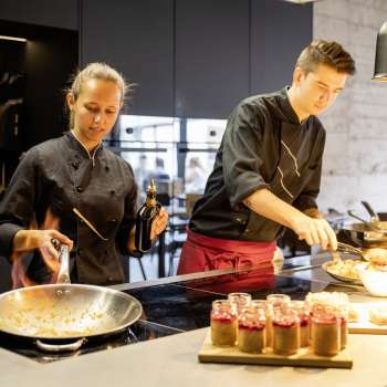 Un dîner entre amis et invités sans stress de préparation - cela ressemble à une soirée de détente. Et comme les meilleures discussions se déroulent de toute façon dans la cuisine, on commence ici par un copieux plateau d'apéro. Le point culminant culinaire est la tavolata préparée en commun selon le modèle italien. La soirée se termine agréablement avec du café et une bouteille de digestif directement sur la table. Menu à 3 plats avec apéritif et amuse-bouches, vin pendant la cuisson et le repas, eau, café/thé et digestif CHF 145 / personne, TVA comprise. Réservable tous les jours à partir de 6 à 30 personnes