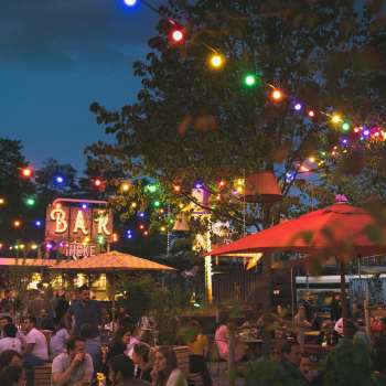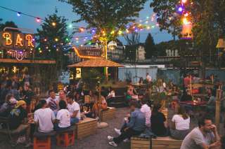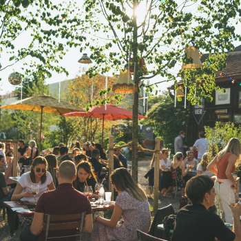 Chez Gustav Gleis, on se retrouve pour boire une bière après le travail et déguster des plats raffinés, entouré d'arbres et d'arbustes sur une place créative unique.