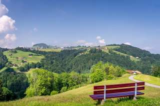 Avis aux cyclistes : sur la piste cyclable de Rehetobel, une descente rapide avec des vues de rêve vous attend. En descendant la Lobenschwendistrasse, la vue s'ouvre sur les montagnes et les forêts de Saint-Gall et d'Appenzell. Un petit banc invite à savourer ces moments pendant une pause.