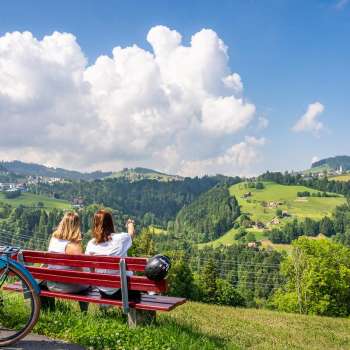 Depuis le point de vue de Rehetobel, les cyclistes et les promeneurs jouissent d'une vue fantastique sur les régions montagneuses et forestières de Saint-Gall et d'Appenzell.