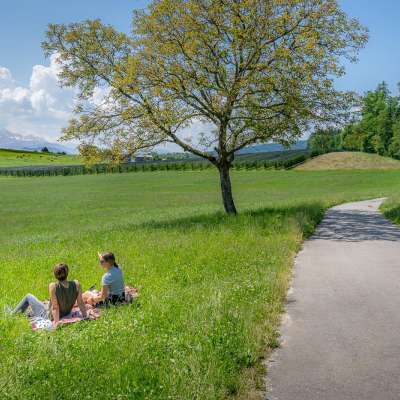 Entouré d'arbres fruitiers en fleurs et de champs de fleurs lumineuses, on se trouve sur le Ruggisberg dans le paradis des pommes. C'est ici que l'on étend sa couverture de pique-nique et que l'on profite d'une pause pour reprendre son souffle après le tour à vélo.