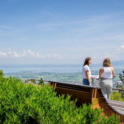 Situé directement sur la piste cyclable, le point de vue de Walzenhausen offre une vue magnifique sur la vallée du Rhin saint-galloise et l'Autriche voisine.