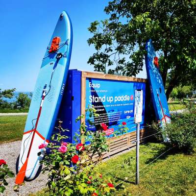 La station de location de SUP en libre-service de Rorschacherberg se trouve près de la place de baignade Hörnlibuck. La station de location peut être réservée et utilisée via une application.