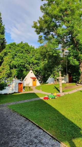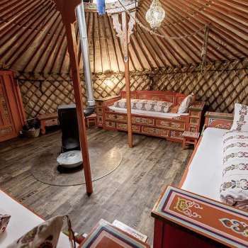 "Glamping"-Village familial avec beaucoup de place pour les aventuriers qui aiment passer la nuit dans des tipis, des yourtes mongoles ou des chalets alpins.