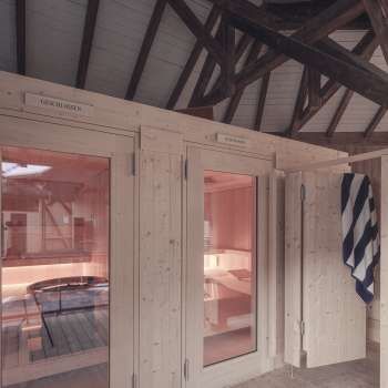 L'équipement esthétique est réduit à l'essentiel : Des vestiaires avec douches, deux salles de sauna avec des températures différentes ainsi qu'une salle de repos avec vue sur la forêt. L'étang de natation romantique invite à se rafraîchir. De vastes chaises longues et des sièges, en partie couverts, invitent à la détente. Un bistrot avec des boissons sélectionnées et une offre pour les petites faims complète l'offre.