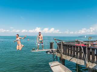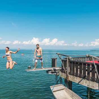 La Badhütte, risalente al 1924, è l’unica struttura architettonica del suo genere conservatasi sulla riva svizzera del Lago di Costanza. Questo stabilimento balneare, completamente realizzato in legno, si erge sulle acque del lago a mezzo di pali ed è raggiungibile dalla sponda solo tramite un ponte. Oltre a una celebre attrazione turistica, esso rappresenta anche un importante punto di ritrovo per gli abitanti locali. Il ristorante con tavoli nel tranquillo cortile interno e sul ponte di accesso è poi a disposizione di tutti i bagnanti, ma anche degli avventori occasionali, per una piacevole pausa a base di drink rinfrescanti, caffè e dolci.