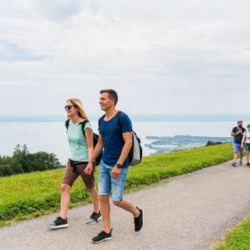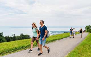 Dopo la prima tappa attraverso prati fioriti e boschi ombrosi, il ristorante Bären vi servirà un ricco antipasto di specialità della Gruber. Rinvigoriti, salite al punto panoramico Fünfländerblick. Godetevi la vista spettacolare sul Lago di Costanza e su cinque Paesi: Svizzera, Austria e gli ex Stati indipendenti di Baden, Württemberg e Baviera. L'escursione prosegue fino al ristorante Treichli, che offre un vero e proprio classico, guarnito da una vista mozzafiato sul Lago di Costanza. Ora è il momento di scendere verso la meta escursionistica Steiniger Tisch, dove vi aspetta un meritato dessert con la migliore vista sui vigneti della Thal. L'ultima tappa termina alla stazione ferroviaria di Rheineck, dove la S-Bahn vi riporterà comodamente a San Gallo. En Guätä!