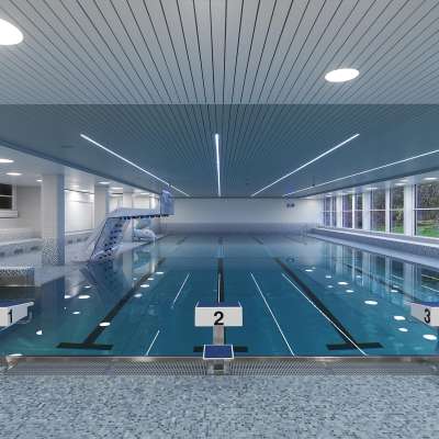 La piscina coperta ha una vasca di 25 metri. La parte superiore della piscina è dotata di un pavimento sollevabile per variare la profondità dell'acqua. Questa parte è quindi perfetta per imparare a nuotare.