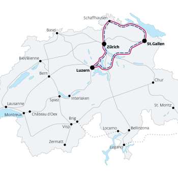 This tour combines historical highlights, fascinating architecture and stunning waterscapes. Start your journey in St.Gallen, home to the baroque Abbey District – a UNESCO World Heritage site. Discover the world-famous Abbey Library with its precious manuscripts and ornate Rococo details. Enjoy a typical St.Gallen bratwurst and taste the region’s sweet «Biber» pastry. Nestled between Lake Constance and the Appenzell region, St.Gallen is the ideal starting point for trips to the lake or to Säntis, the Alpstein’s highest peak. Travel on the Voralpen-Express to Lucerne, the social and cultural heart of Central Switzerland, and then continue to Zurich – a vibrant city with a charming old town. Round off your journey with a visit to the spectacular Rhine Falls, Europe’s largest waterfall.