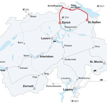 Tour Switzerland by train! On this 1,280-kilometre route, you can explore the best of Switzerland by public transport all year round. You can start your adventure at any point along the route – for example, you could hop on board in Zurich and stop in the Eastern Switzerland city of St.Gallen, or vice versa.