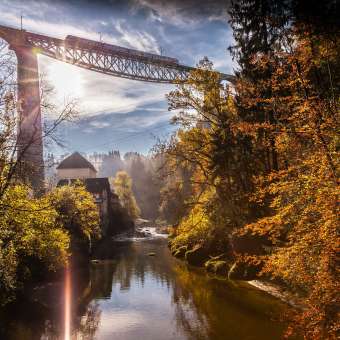The green hills and gentler mountain landscapes here, so often overshadowed by the towering peaks, also have their charm. The Voralpen Express runs between Lucerne and St.Gallen. It starts at Lake Lucerne, with its famous panoramic view of the Alps of Central Switzerland. The Voralpen Express crosses Lake Zurich and passes Rapperswil, the town of roses. On the approach to St.Gallen, you will see another notable sight: the Sitter Viaduct. At 99 metres, it is the highest railway bridge in Switzerland. Once in St.Gallen, you can visit the historic Abbey District, which has been a UNESCO World Cultural Heritage site since 1983.